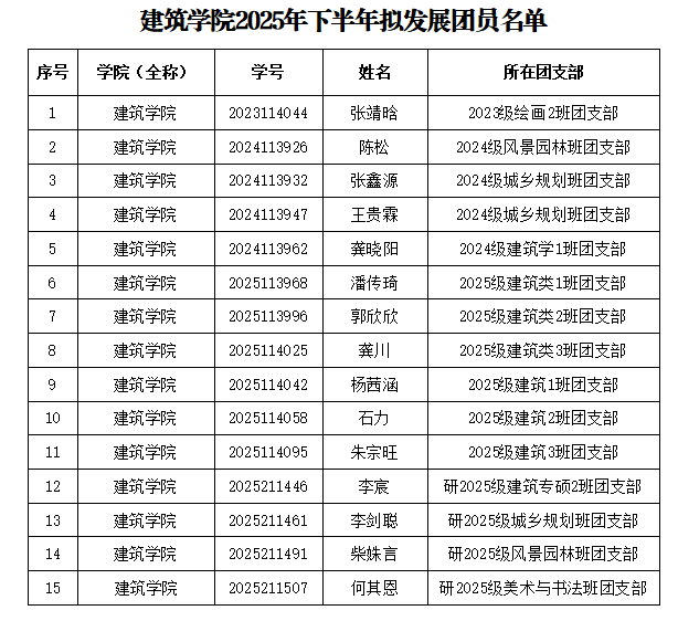 现对拟确定的发展团员名单予以公示,公示期为5个工作日,自2025年11月19日—2025年11月25日17:00。如有异议请于11月25日17:00前至犀浦校区X8226办公室王老师处当面反映,恕不接受匿名反馈。联系方式:028-66367796。