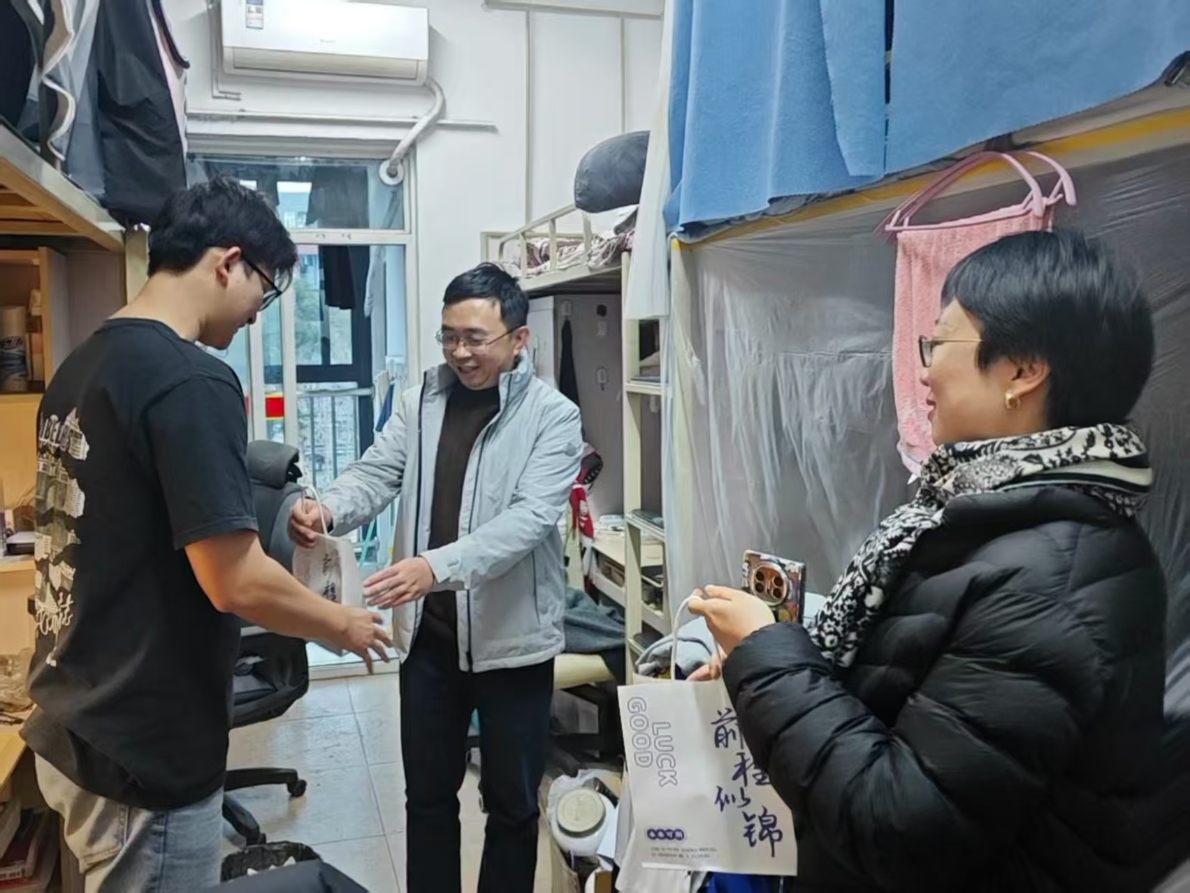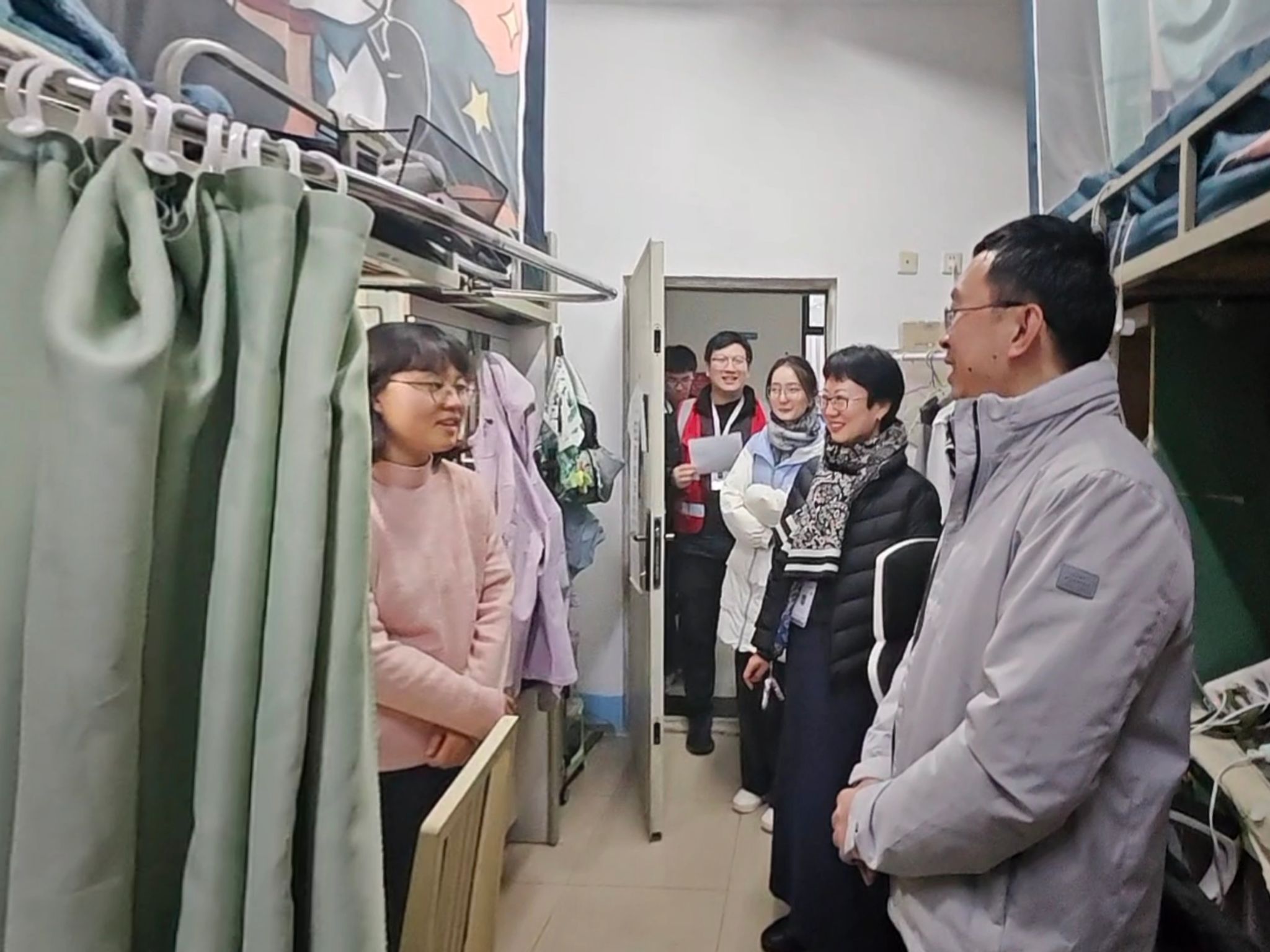 为切实关心毕业年级学生成长发展,帮助学子缓解压力、坚定信心,12月16日下午6点,建筑学院开展2025年“心系学子,暖心筑梦”毕业年级慰问活动,学院党委书记胡伟、党委副书记刘一杰、团委书记田方舟以及毕业年级辅导员老师前往学生宿舍,与毕业生面对面交流,送去关怀与祝福。