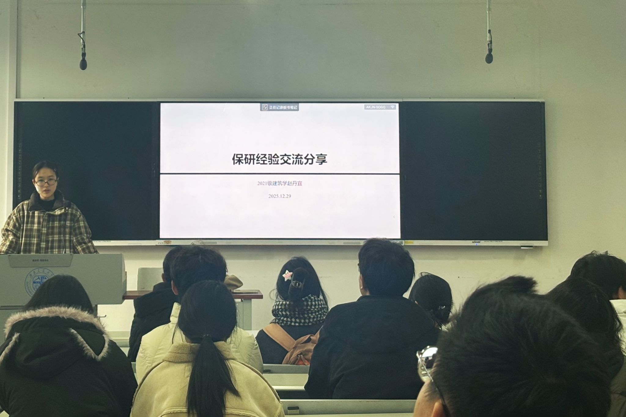 为发挥朋辈榜样作用,搭建交流学习平台,12月29日11:30,西南交通大学建筑学院“听建·朋辈新语”分享会于X8521教室举办。活动邀请了“竢实扬华奖章”获得者、建筑学2021级本科生赵丹宜,以及“忠忱班集体”获奖代表、城乡规划2022级本科生张伊珺,为同学们分享经验与心得。