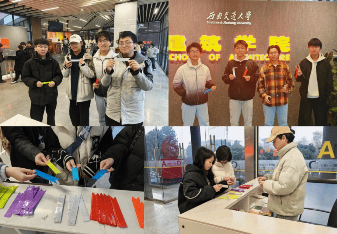 2025年12月26日至29日,西南交通大学建筑学院学生会于八号教学楼开展“微光护航·平安夜行”校园反光条发放活动,以小小反光条为笔,为深夜赶路的学子勾勒出安全的“微光防线”。